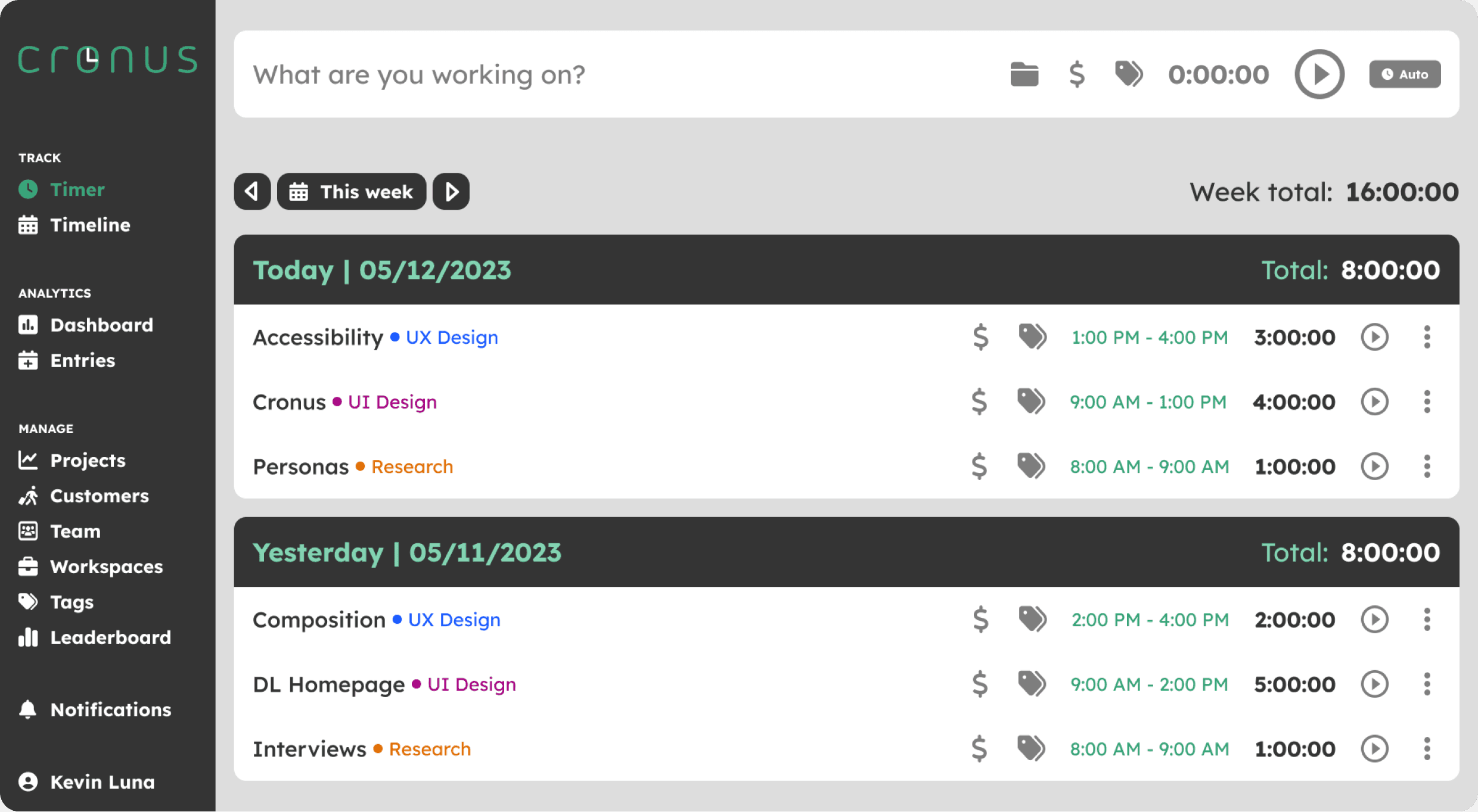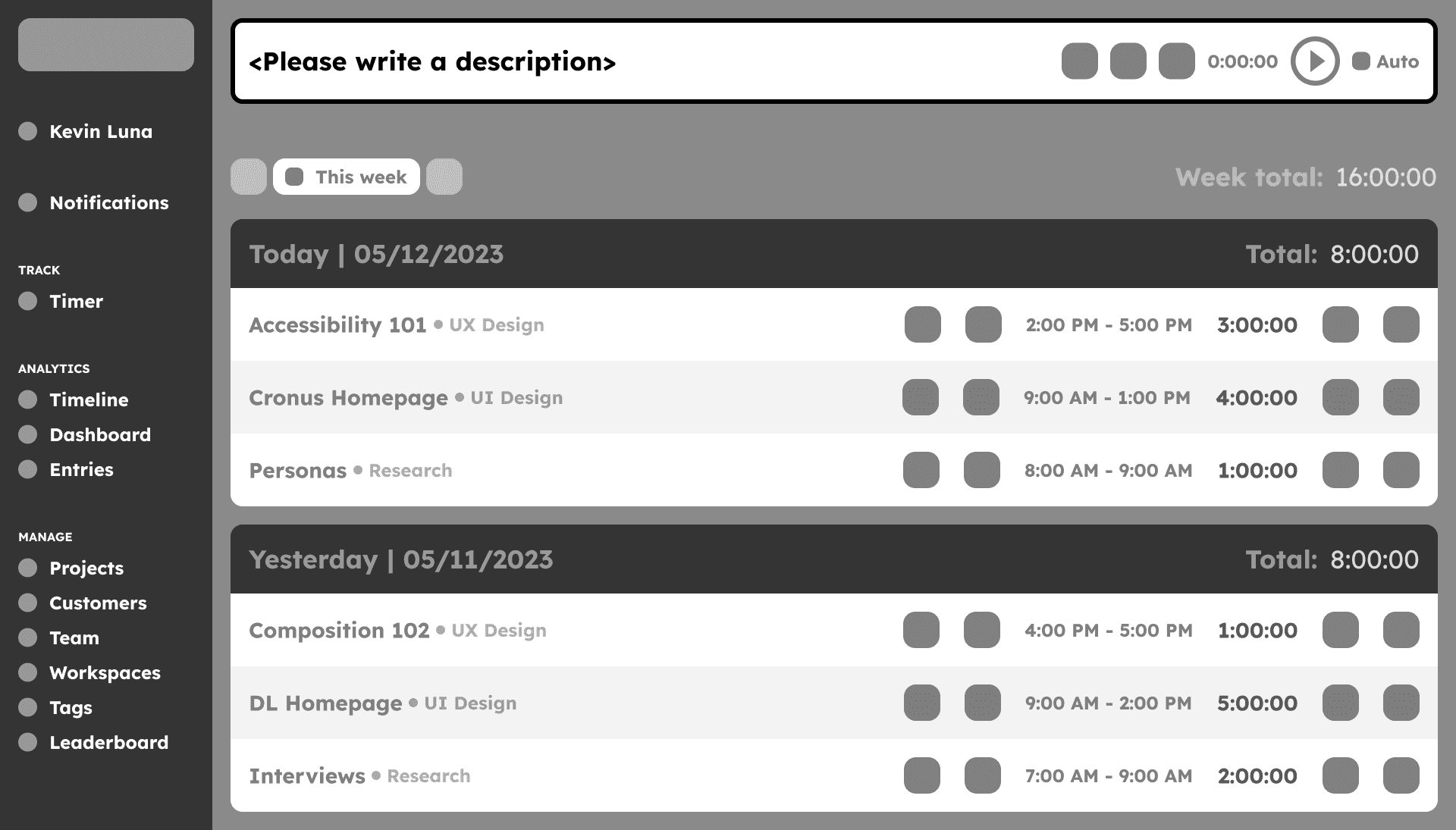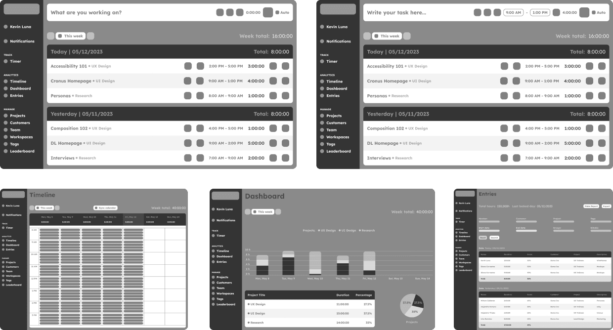 Clockify: They separate the timer and timetable like Cronus and unlike Toggl. The timer’s hierarchy and contrast is easily visible and helps to know quickly the timeframe for certain tasks, but the design in general looks a bit outdated. The dashboard and entries are also easily understandable to know how much time was spent in certain situations.