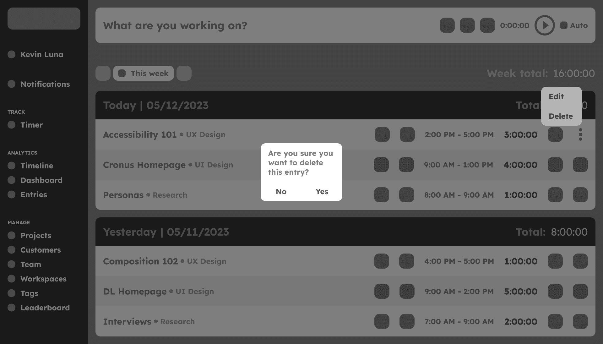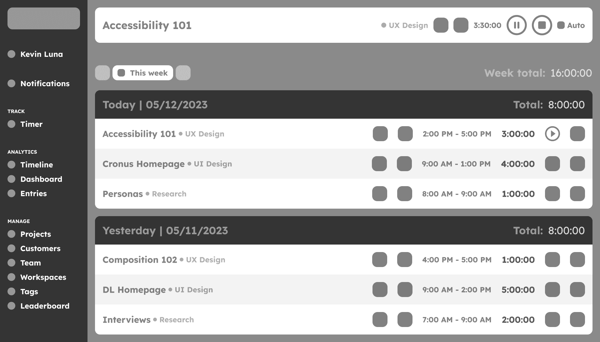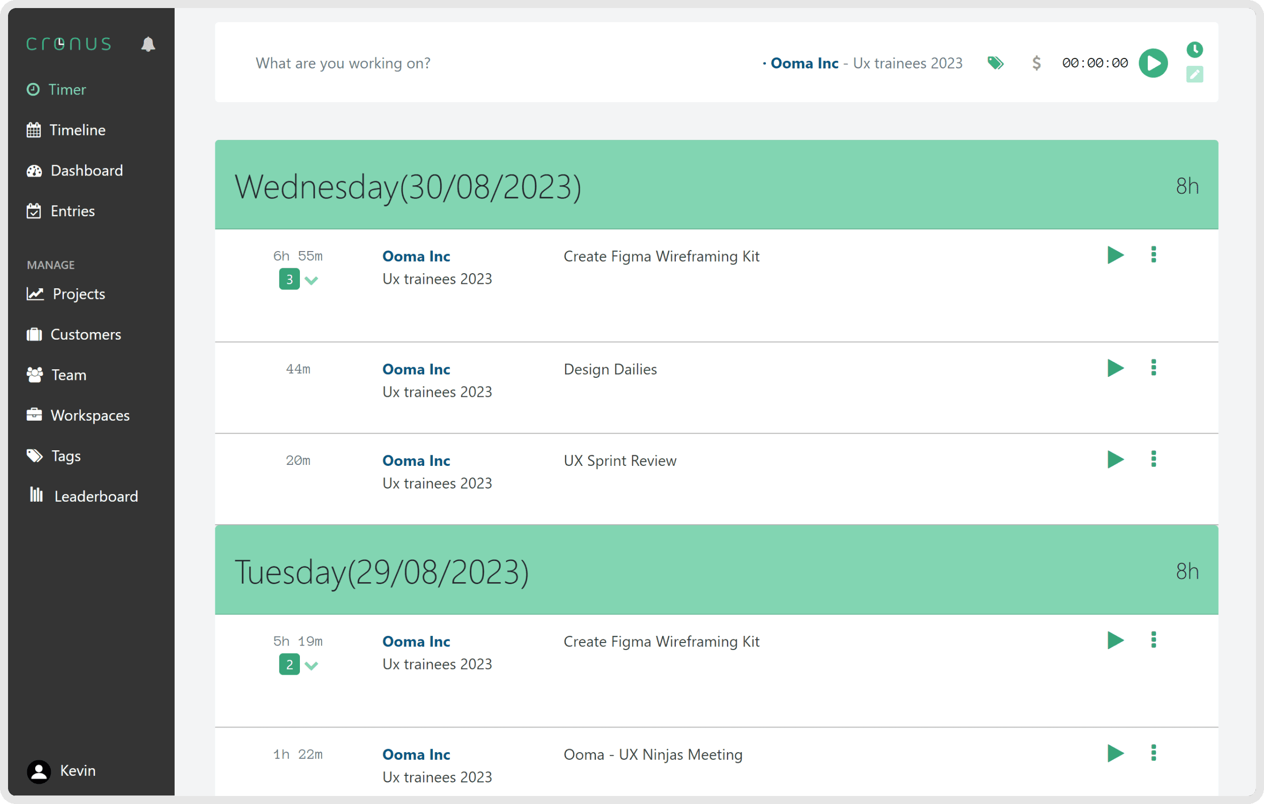 Clockify: They separate the timer and timetable like Cronus and unlike Toggl. The timer’s hierarchy and contrast is easily visible and helps to know quickly the timeframe for certain tasks, but the design in general looks a bit outdated. The dashboard and entries are also easily understandable to know how much time was spent in certain situations.