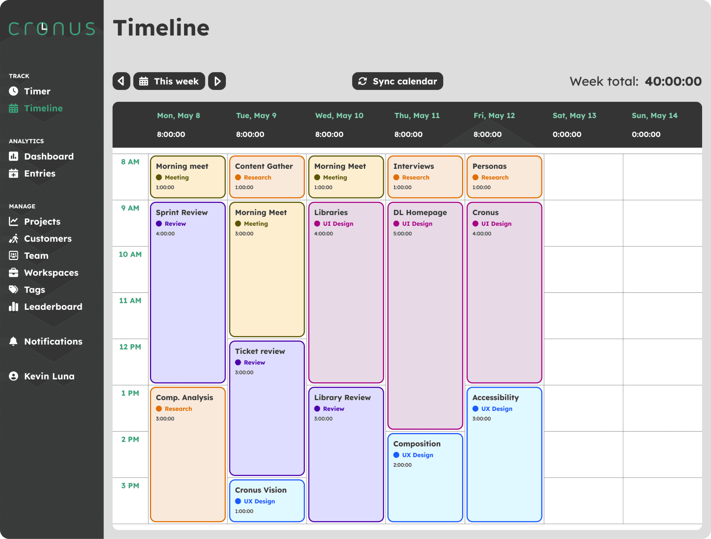 On this view the user can see the tasks they’ve performed in a calendar view and select them without any trouble. They have colors to categorize them as well as the ability to change between different weeks and synchronize different calendars they use to add recurrent meetings.