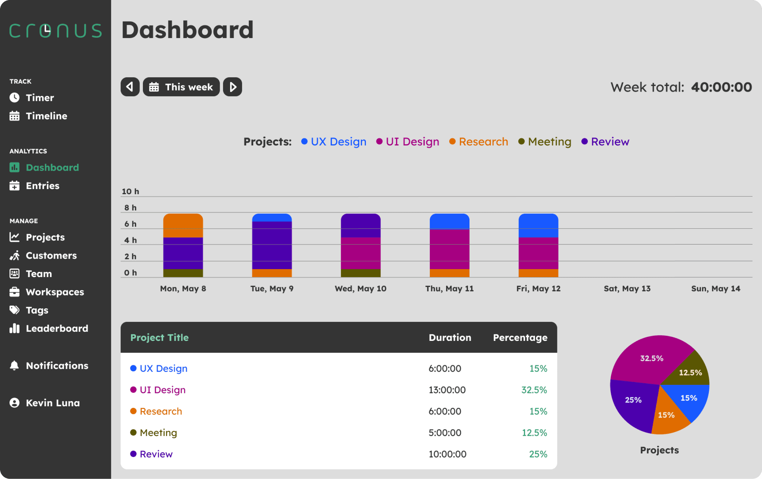 Here the user can review the percentage of time they’ve spent in different types of tasks. Having different types of colors helps to visualize where they’ve spent more time and review if that’s the amount of time they want to spend on those categories.