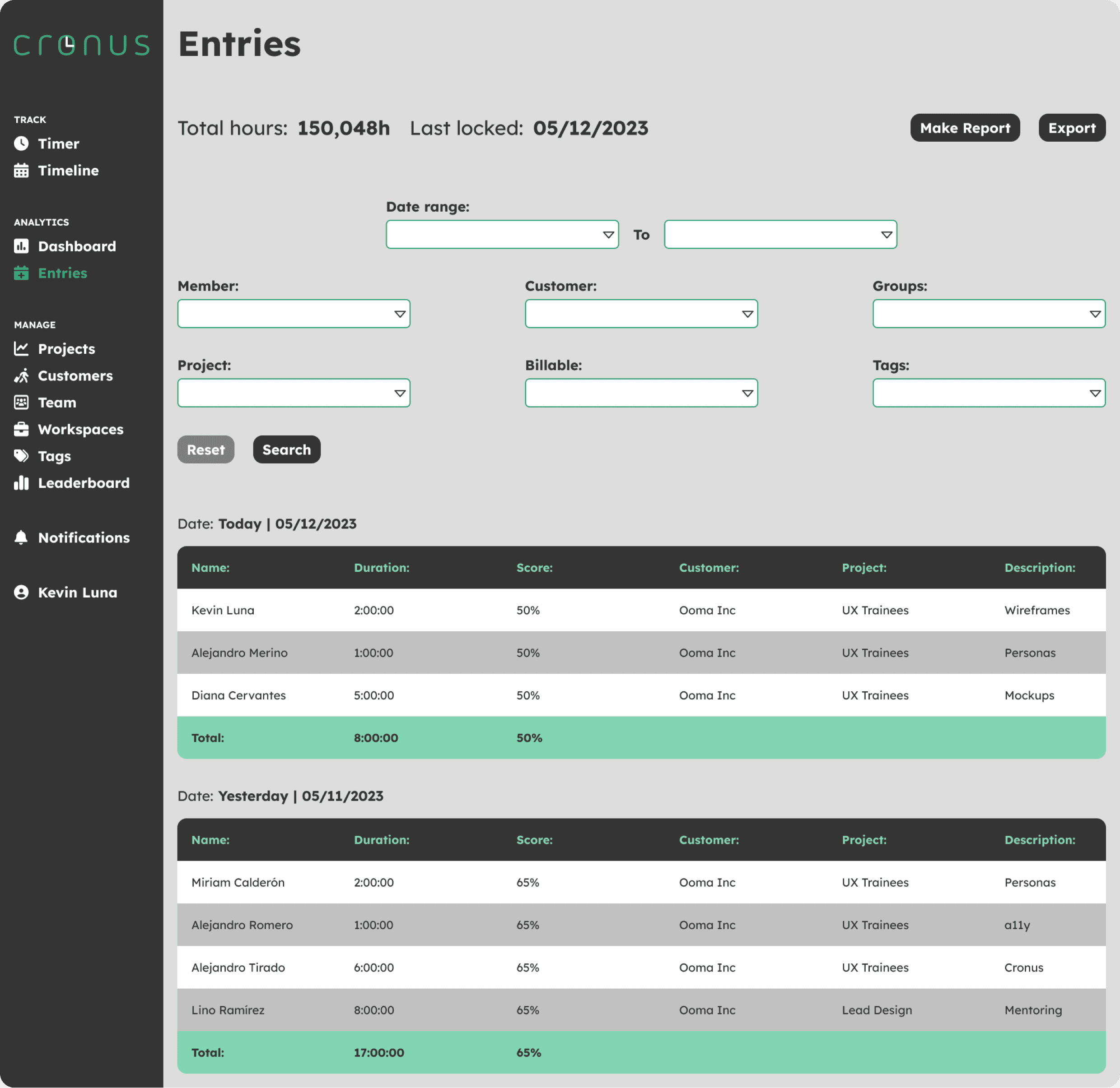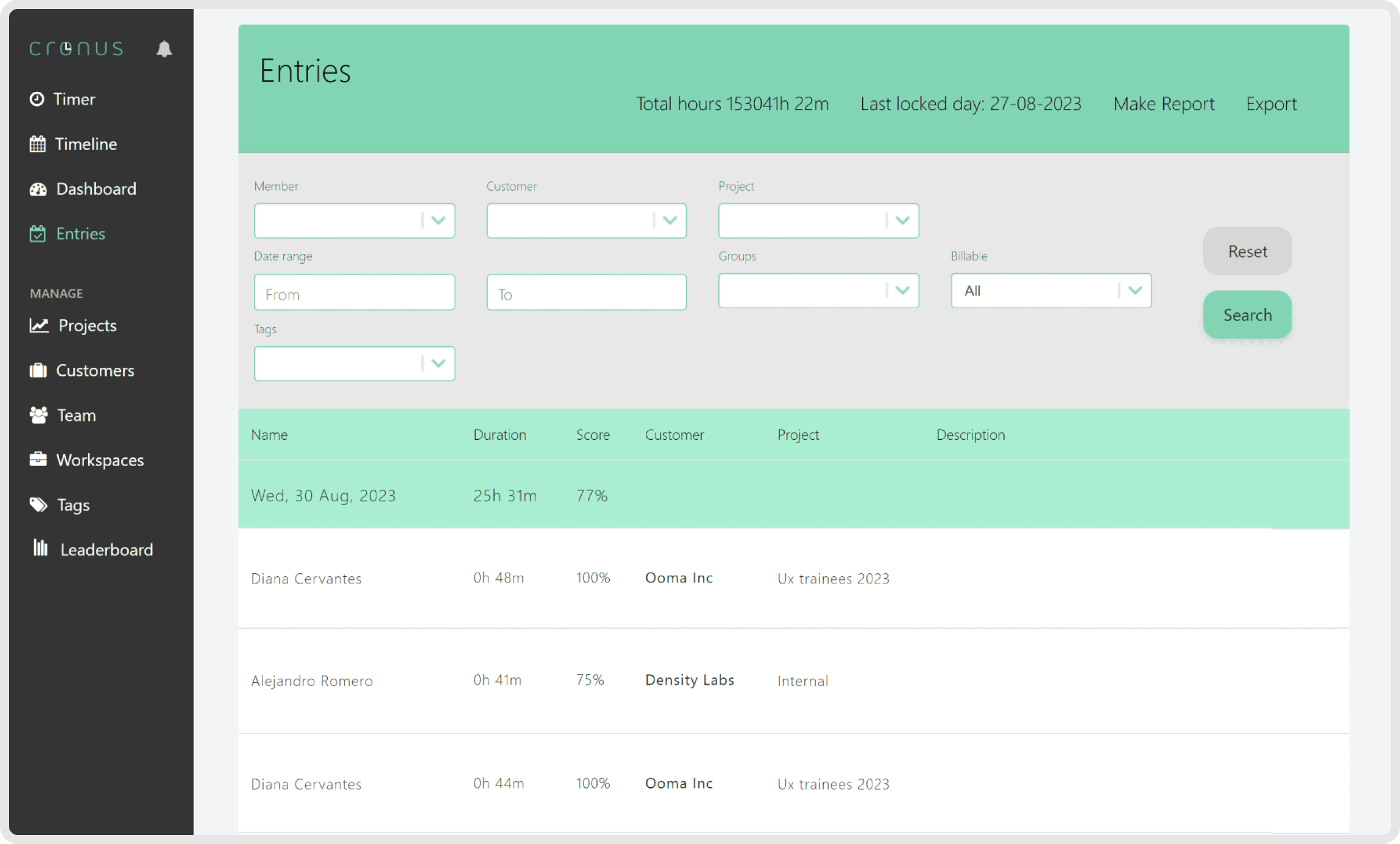 In this view, the user can check the history of all of their entries and apply certain filters to review by different categories. They can also review entries of co-workers to understand where different teams are spending most of their time.